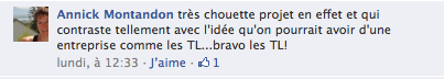 – Au sujet de la « créativité exogène », il faut bien se rendre compte que oui, le résultat de la campagne est conforme à l’image que l’on se fait (ou que l’on souhaite donner car nous avons mené de front plusieurs projets: stratégie de marque + stratégie digitale + développement de tl pulse ) de notre entreprise. Tout ceci n’est pas un hasard et ne nous échappe pas car cela ne doit pas être vu sous l’angle « réseaux sociaux » uniquement. Cette campagne FB doit être vue dans le cadre de la campagne globale visant à promouvoir une offre censée fidéliser à terme les jeunes. Et surtout, cette campagne est cohérente avec la stratégie de marque (l’image souhaitée) de l’entreprise (une entreprise qui développe son capital relationnel et son capital imaginaire. C’est à dire une entreprise ouverte, qui développe des relations/interactions, de l’affect pour contribuer à donner du souffle à l’agglo …). Mais elle est aussi cohérente avec la stratégie digitale (présence numérique) et les lignes directrices marketing de l’entreprise (présence terrain + présence digitale, client = partenaire, relation = interaction/participation …) …