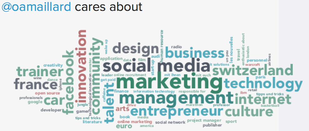 Ses domaines d’expertises vus par son activité sur les médias sociaux prend les formes suivantes sur Mirror.me ou klout.com